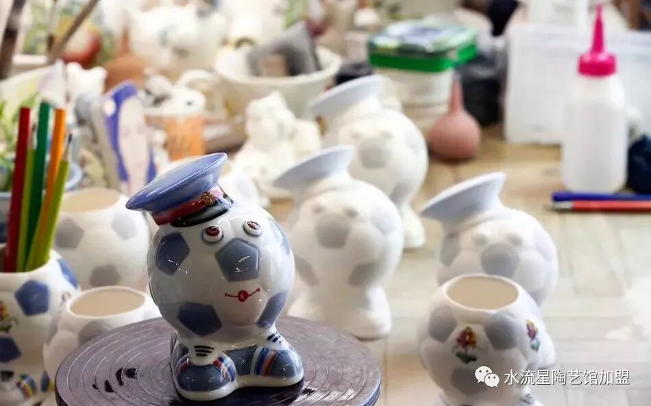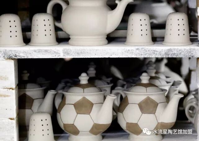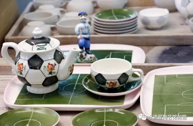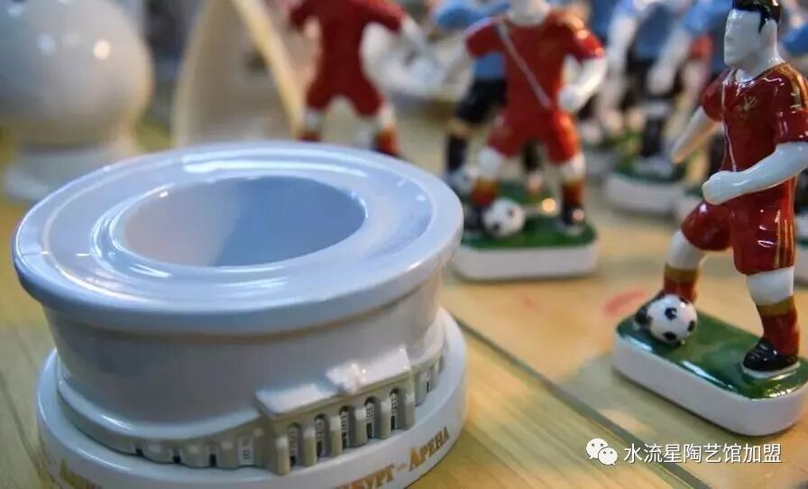 這些陶瓷品個(gè)個(gè)栩栩如生精美絕倫。還有各式各樣以足球?yàn)橹黝}的茶壺、茶杯、彩盤、筆筒。